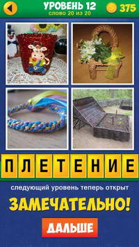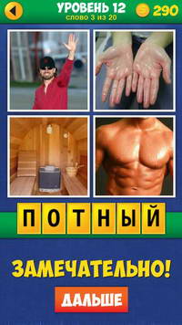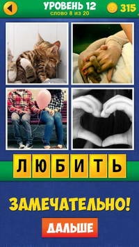 Игра 4 фото 1 слово Экстра подходит к концу. Мы готовы поделиться с вами ответами на предпоследний уровень игры 4 фото 1 слово. В двенадцатом уровне 20 заданий. Задача остается прежней – необходимо угадывать слова, которые объединяют четыре картинки. Это могут быть существительные, прилагательные, глаголы. Я думаю, что к концу игры 4 фото 1 слово Еще Слова вы уже приобрели достаточно опыта, чтобы с легкостью отвечать на задания. Однако бывает всякое… И очень обидно, когда не получается подобрать «хитрое» слово и вписать его в пустые ячейки. Даже одно неразгаданное слово сможет воспрепятствовать переходу на последний, тринадцатый уровень 4 фото 1 слово. Вот тут то вам и пригодятся наши ответы на игру 4 фото 1 слово!