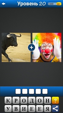 2 картинки 1 слово - 20 уровень 1. Бегущий по песку бык 2. Клоун в белых перчатках Ответ: РОДЕО |