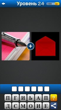 2 картинки 1 слово - 24 уровень 1. Металлическое перо для письма 2. Красный открытый конверт на черном фоне Ответ: ПИСЬМО |