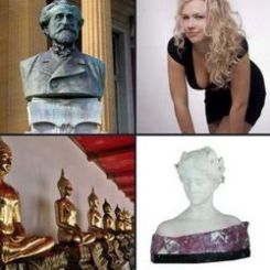 4 фото 1 слово ответы уровень 332: 1. Памятник учёному или писателю 2. Девушка блондинка в чёрном платье 3. Ряд золотых статуй Будды 4. Гипсовая статуя женщины, голова и плечи 4 буквы Правильный ответ - БЮСТ |