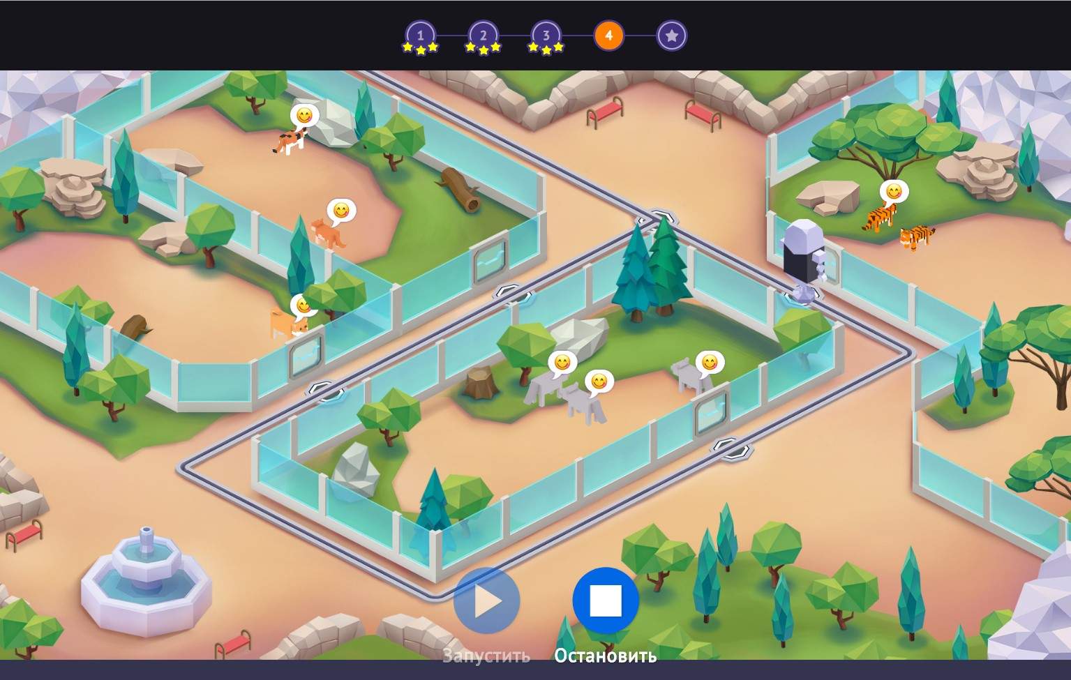 В четвертом уровне делать ничего не придется, так как в нем можно только наблюдать за тем, как работает настроенный вами алгоритм. Если все сделано верно, как мы показали вам, то все животные смогут получить правильный корм, сытно покушать и остаться довольными. Если что-то вы сделали не так, что не все животные окажутся сытыми и голодные останутся расстроенными.