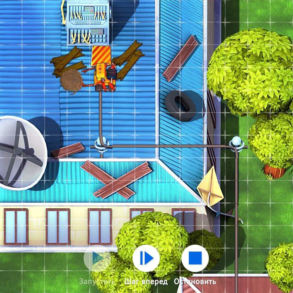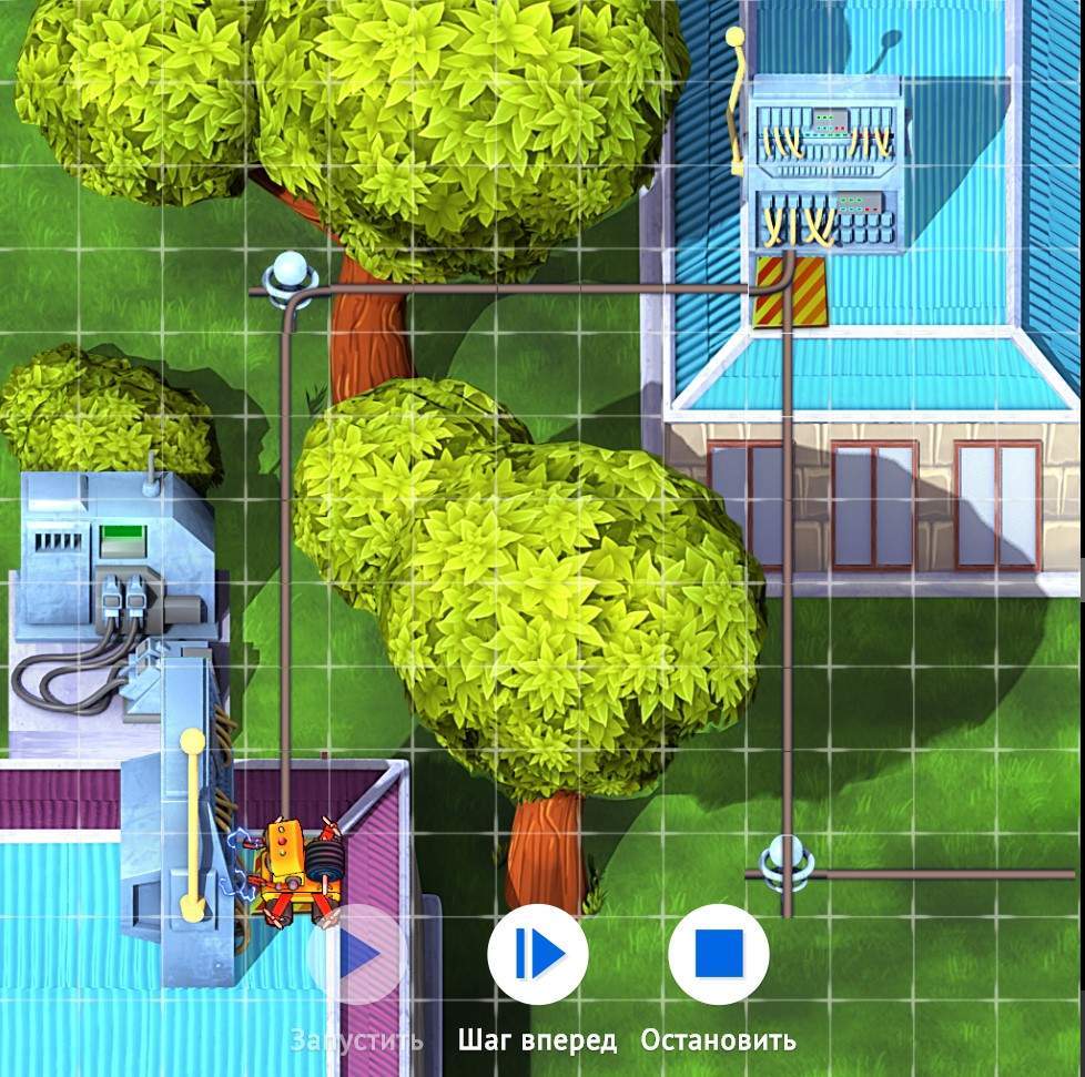 Летим дальше. Нужно подключить ещё два дома к Интернету через кабель. Подъезжай к выделенной клетке и используй команду plug, чтобы робот мог подсоединить кабель.