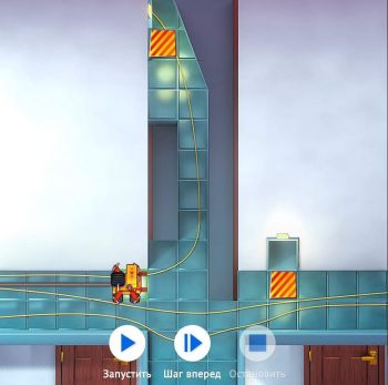 Проведи кабель через столбы к щитку. Препятствие с пути можно просто убрать в сторону. Для этого используй команды take (взять) и put (положить). Не забудь в конце подключить кабель. Чтобы взять гнездо или положить его, надо остановиться перед ним. Чтобы взять используй команды take (взять) и put (положить).