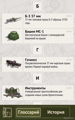 Пожалуй, отдельно стоит отметить в игре Tank Masters историческую справку. Как только игрок получает новый элемент, система дает краткую характеристику вооружения и позволяет дальше заниматься созданием новой техники. Хотя если вы неравнодушны к военной теме, можно заглянуть в глоссарий, где есть вся информация о совершенном вами открытии. Здесь можно узнать, почему в военной технике нашла применение шестигранная форма, какую роль сыграл в танкостроении Микулин и многое другое.