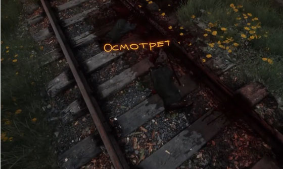 Отправляемся дальше по шаткому мосту, доходим до поезда осматриваем его, где увидим улику про рукоятку, спускаемся вниз по железной дороге до отрубленных ног, где их и осматриваем чуть подальше от них по железной дороге поднимите канистру и рядом осмотрите будет пенёк возле которого валяется камень. Далее идём к отрубленным ногам и по кровавому следу добираемся до трупа.