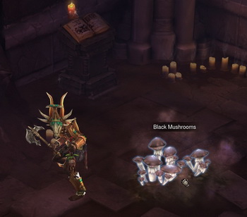 Черный гриб – самый лёгкий предмет из вышеперчисленного. Он выпадает довольно часто на первом уровне собора в первом акте. Комната появляется произвольным образом, но выглядит всегда одинаково и мимо растущих на полу грибов пройти трудно, особенно если гриб выпал: все квестовые вещи подсвечиваются, как и легендарные предметы, лучом света в потолок. Гриб выпадает на любой сложности и при любой силе монстров, так что за полное прохождение (Обычный - Кошмар - Ад - Пекло) он у вас точно появится.