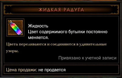 Жидкая радуга. Самый сложный элемент для секретного пони уровня в Diablo 3: нам нужно найти Алхимика в первом "кармане" Далгурского оазиса. после телепорта "Выход к Оазису". Алхимик стоит там очень редко, и даже выход на локацию с 5-ю уровнями нефалемской доблести и максимальным бонусом к поиску магических предметов не гарантирует его появление. После того, как вы защитите Алхимика от нападающих мобов, он откроет вам "Таинственную пещеру", в которой вам нужно досканально изучить первый уровень. Именно на первом уровне таинственной пещеры может оказаться заветный "Таинственный сундук", внутри которого нет привычных золота, камней и прочего лута, а лежит лишь один предмет - Жидкая радуга. Чтобы фармить радугу, выберите Задание "Хорадрим-предатель" - "Заброшенные руины". Вы появляетесь у выхода к оазису, от которого до потенциальной таинственной пещеры рукой подать. Для верности ставьте сложность Ад и силу монстров 10. Если будет тяжело - смените сложность на Кошмар. Если Алхимик на карте появился - не спешите радоваться: в пещере может не оказаться нужного сундука. Если у вас по максимуму заряжен бонус к магическим предметам, то он там появляется примерно в 50% случаев.