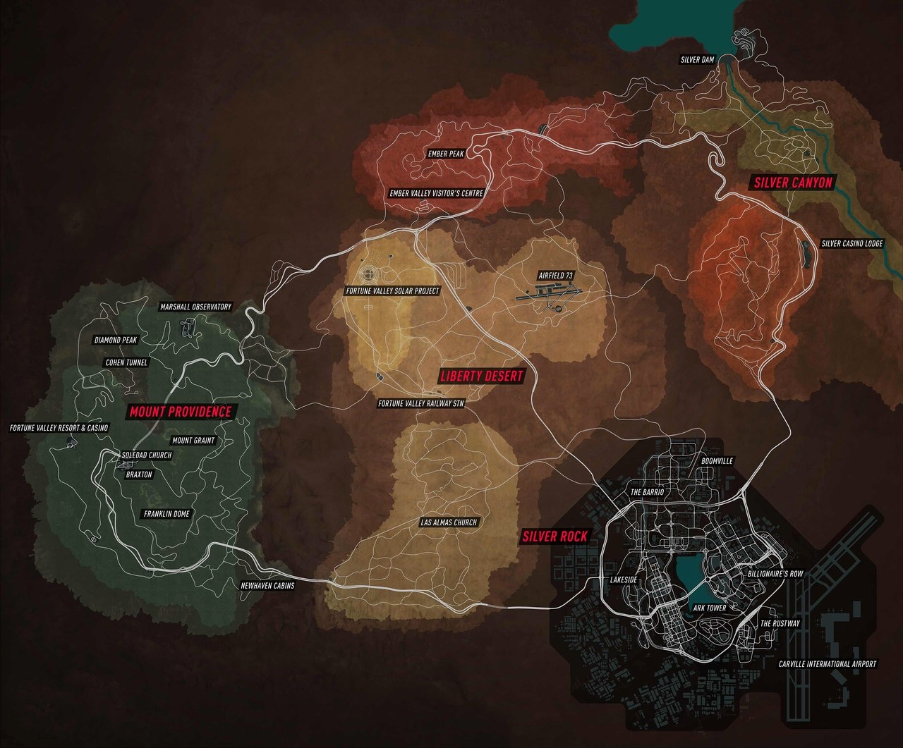 - Либерти-Дезерт – из названия несложно понять, что это пустыня. Находится она недалеко от города Сильвер-Рок. В этой локации вас ждет пыль, бездорожье и пробитые шины. Ключевые места: аэродром, солнечный проект и две станции.