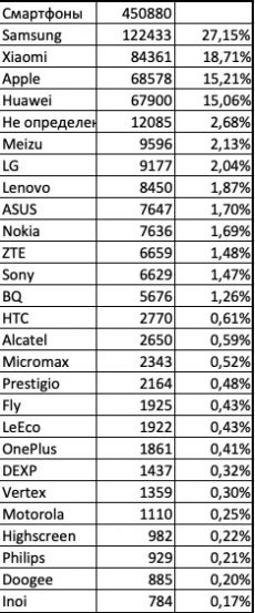 Задуматься над адекватностью этого рейтинга нас заставило присутствие «российской» компании Bright & Quick. Она закупает китайские смартфоны, вешая на них свой логотип. Стоят телефоны этой фирмы, конечно, немного, но за счет этого сложно отхватить такой кусок пирога. Поэтому мы решили провести собственное расследование, изучив статистику нашего сайта. Мы проанализировали заходы со смартфонов за последний месяц, выделив лидеров. Выборка немалая – 450 000 устройств. Вот что у нас получилось: